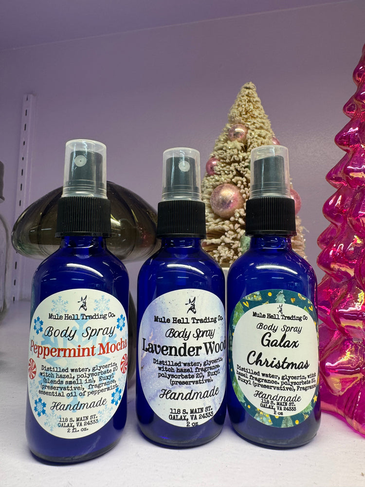 Made with: Distilled water, glycerin, witch hazel, polysorbate 20 (blends smell in),  Euxyl (preservative).  blends of essential oils & fragrance.