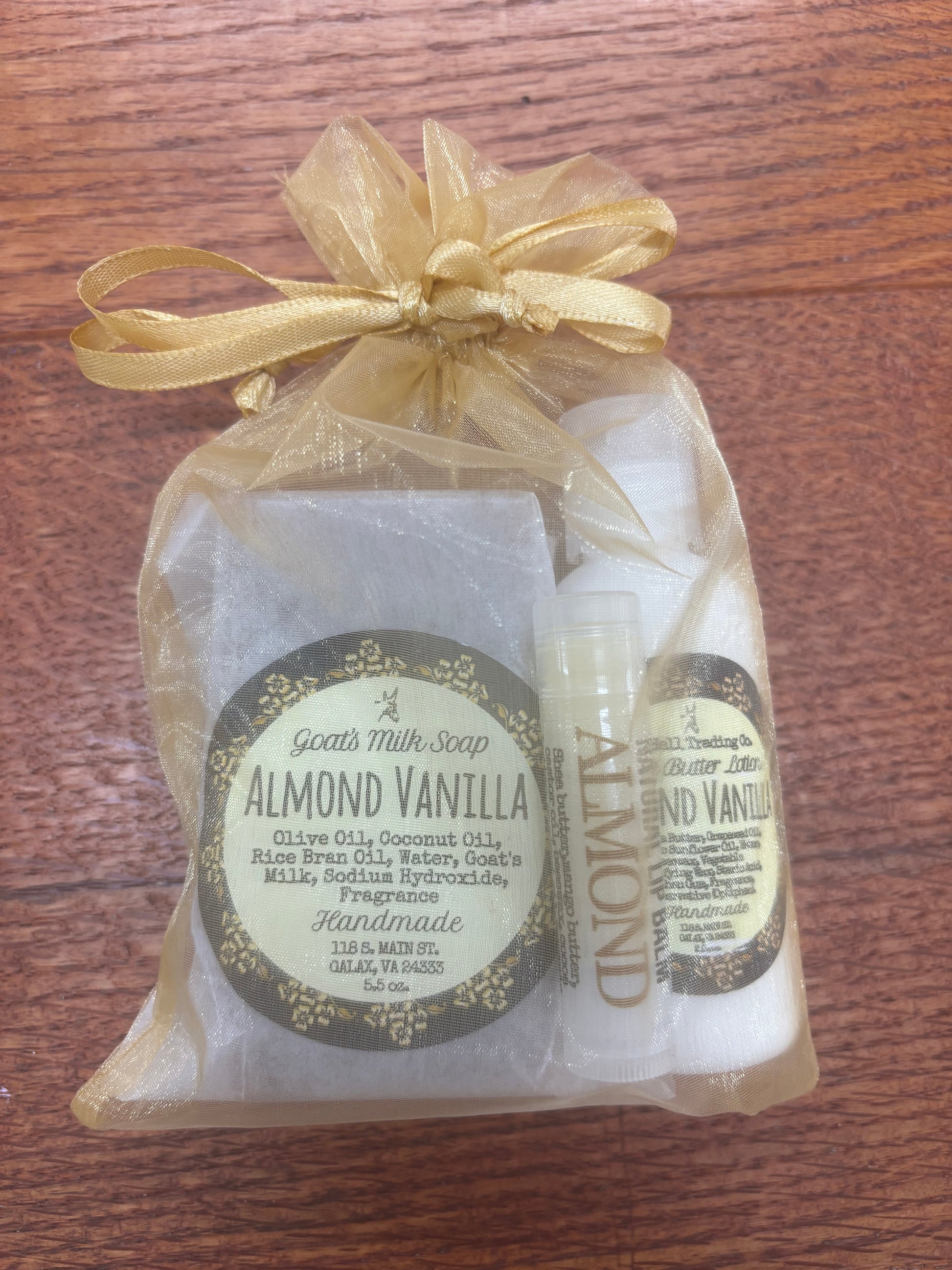 Gift set includes a goat milk bar soap, 2 oz shea butter lotion and lip balm wrapped in a colorful organza bag.