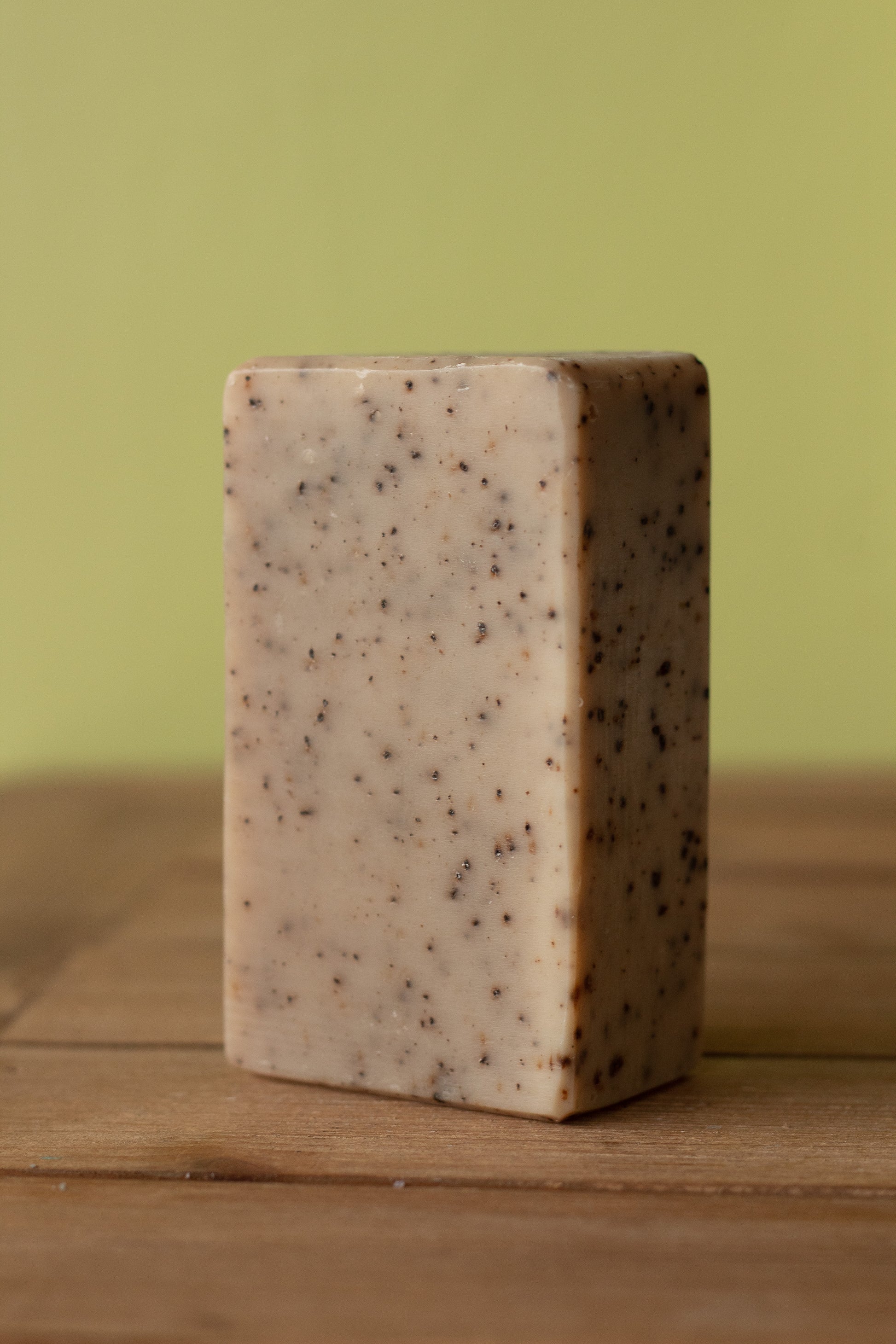 Ingredients: Saponified oils: Olive oil, coconut oil, palm kernel oil, and rice bran oil, water, goat's milk, coffee grounds, spearmint essential oil, bentonite clay.