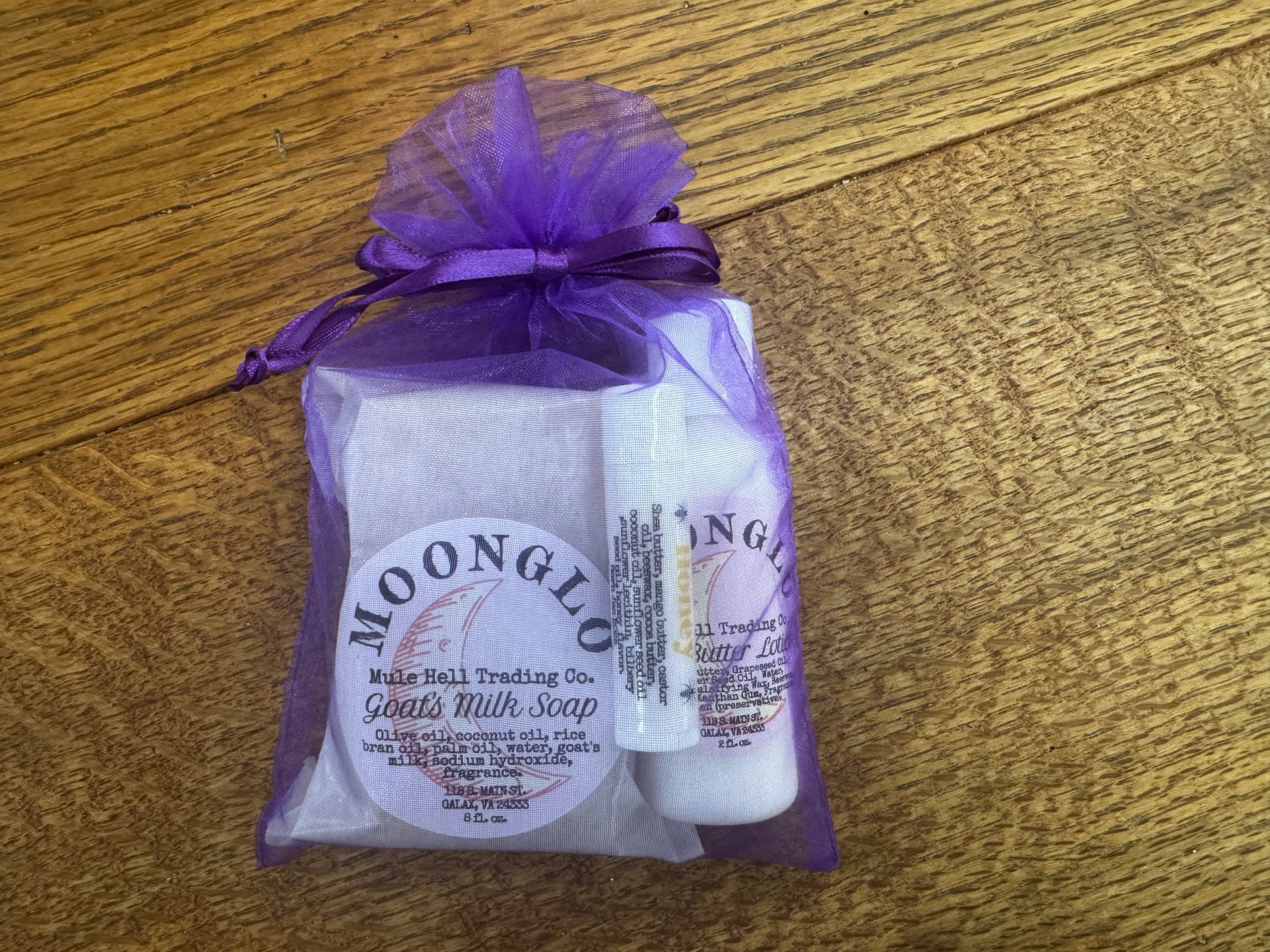 Gift sets come with a 5.5 oz goat milk bar soap, a 2oz shea butter lotion and a lip balm, wrapped in a colorful organza bag.